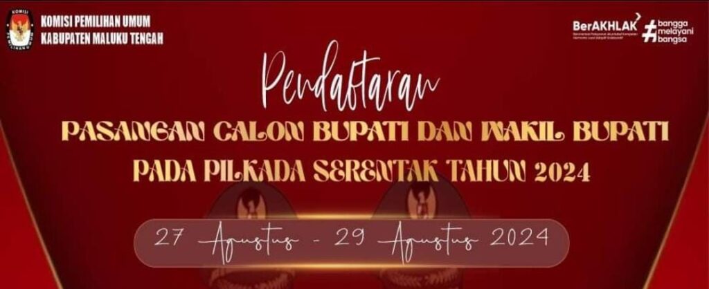 Komisi Pemilihan Umum (KPU) Kabupaten Maluku Tengah, secara resmi membuka pendaftaran Calon Bupati dan Calon Wakil Bupati 2024 – 2029. Pendaftaran Calon Bupati dan Calon Wakil Bupati Maluku Tengah dibuka mulai hari ini, Selasa (27/08/2024), selama tiga hari. Dan jadwal pendaftaran hari pertama dan hari kedua dibuka sejak pukul 08.00-16.00 WIBT, sedang hari tiga hari terakhir di buka […]