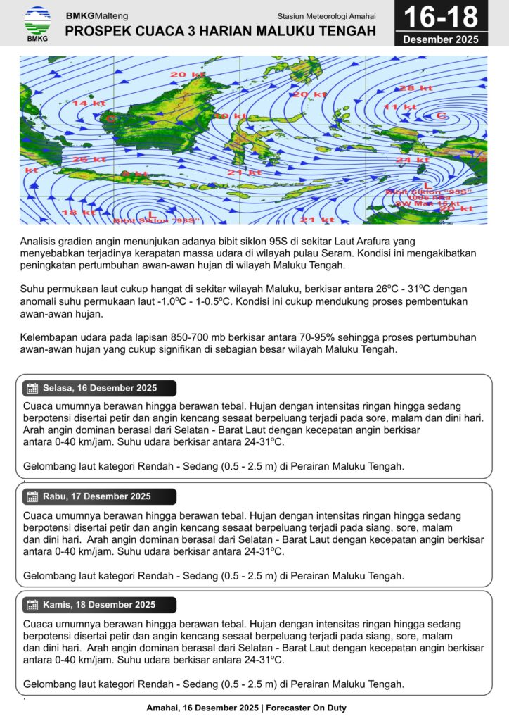 Prospek Cuaca 3 Harian Wilayah Maluku Tengah, Tgl 16 – 18 Desember 2025