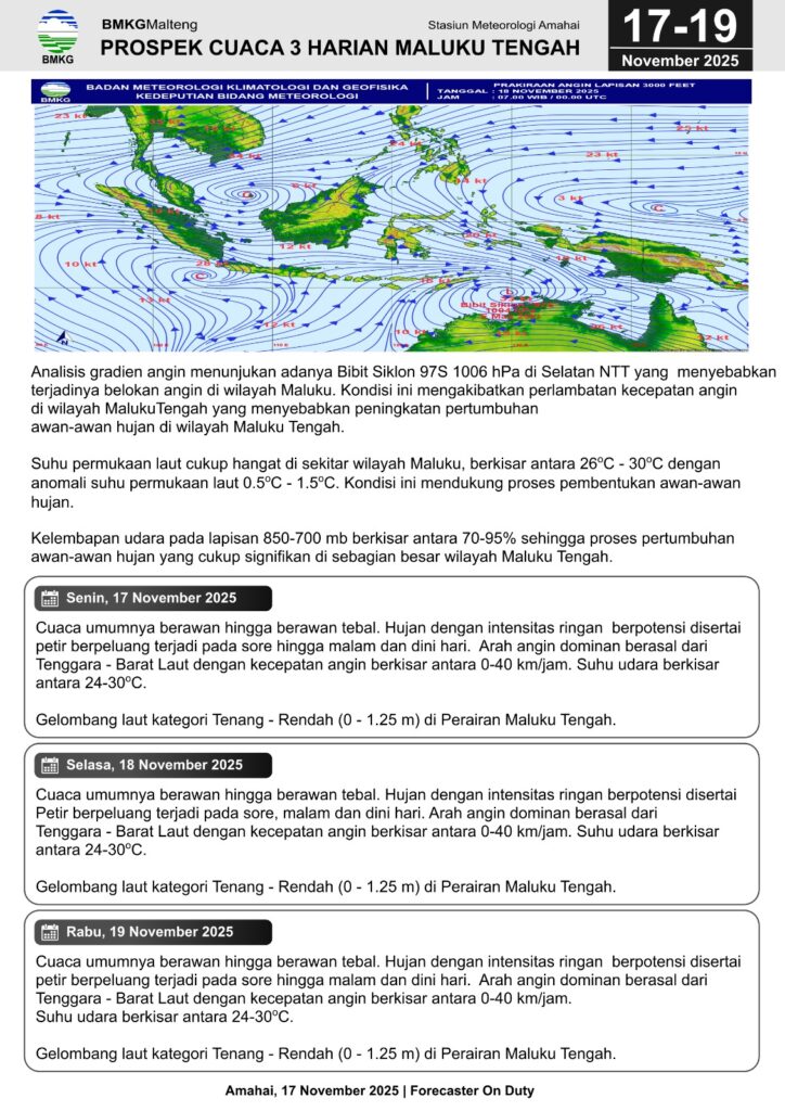 Prospek Cuaca 3 Harian Wilayah Maluku Tengah, Tgl 17 – 19 November 2025